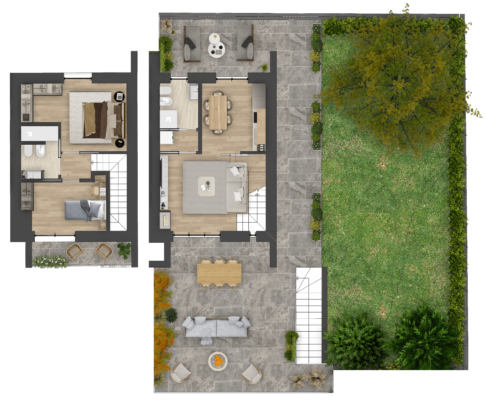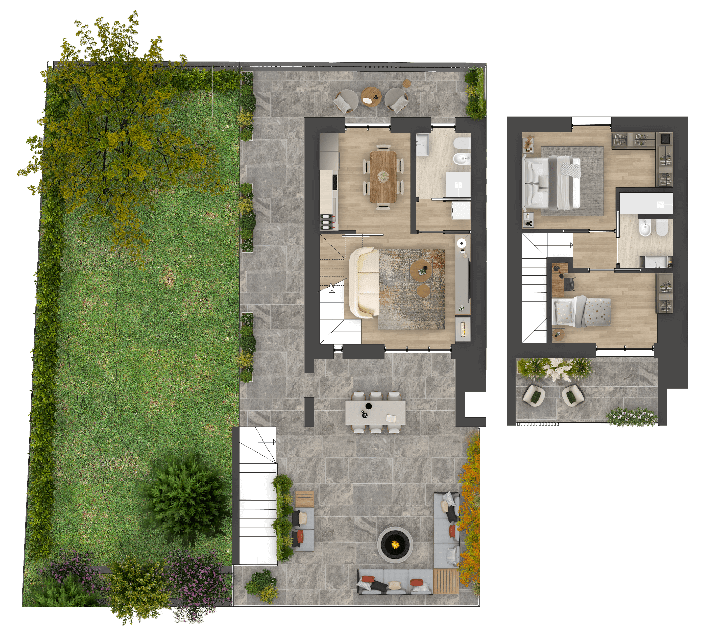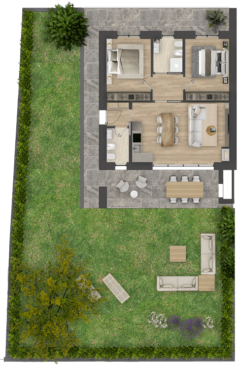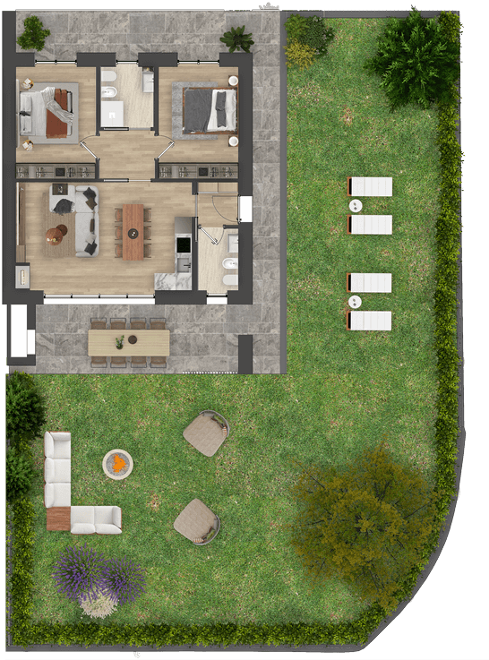 Tutte le soluzioni dispongono di due camere da letto e due bagni, oltre a un ampio giardino privato, ideale per momenti di relax, convivialità e per apprezzare appieno il contesto naturale che circonda la proprietà.