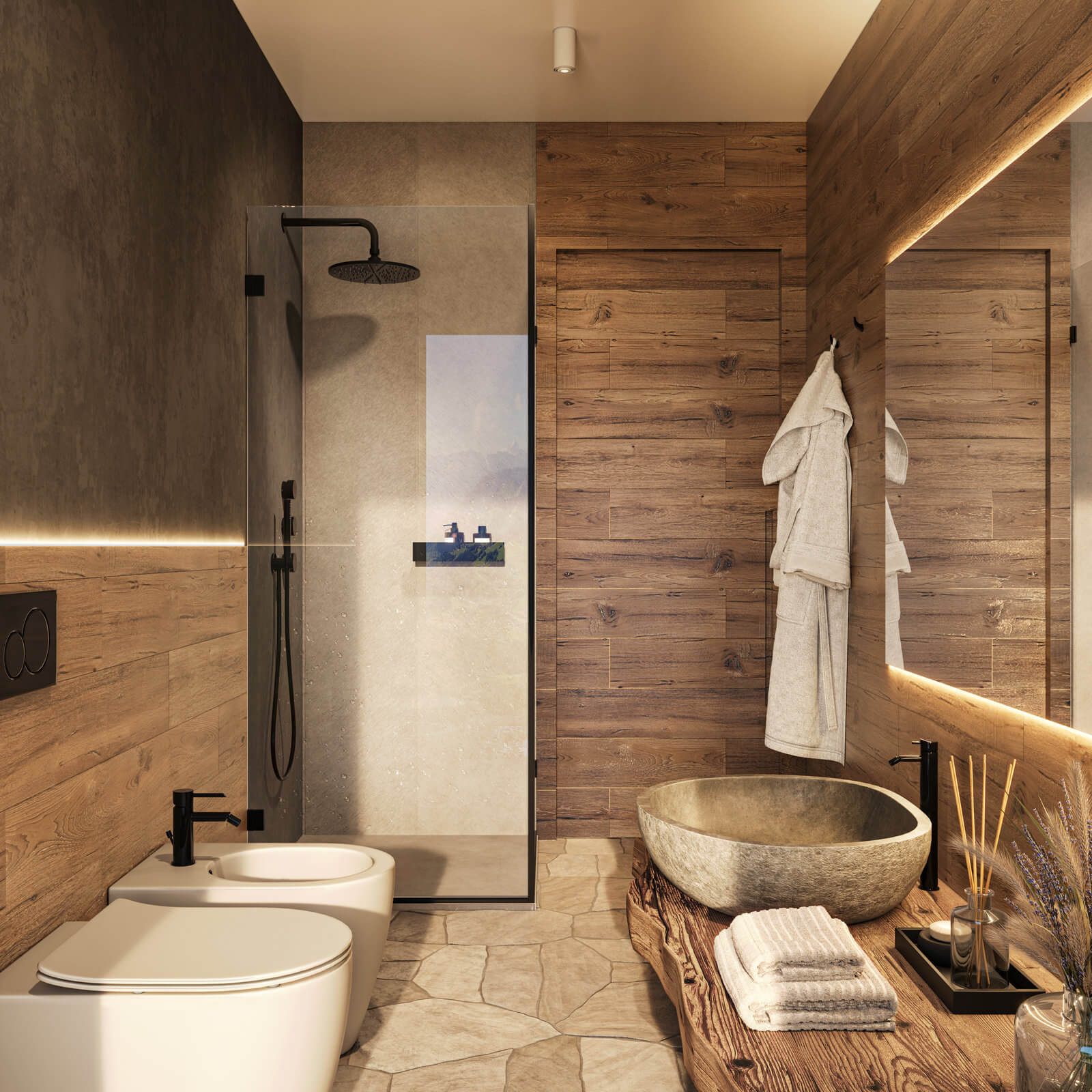 Elementi in pietra naturale arricchiscono gli spazi, creando dettagli preziosi e un dialogo armonioso con l’ambiente esterno. Le zone living sono ampie e accoglienti, mentre le camere offrono un clima intimo e rilassante, pensato per vivere la montagna in tutta la sua essenza.