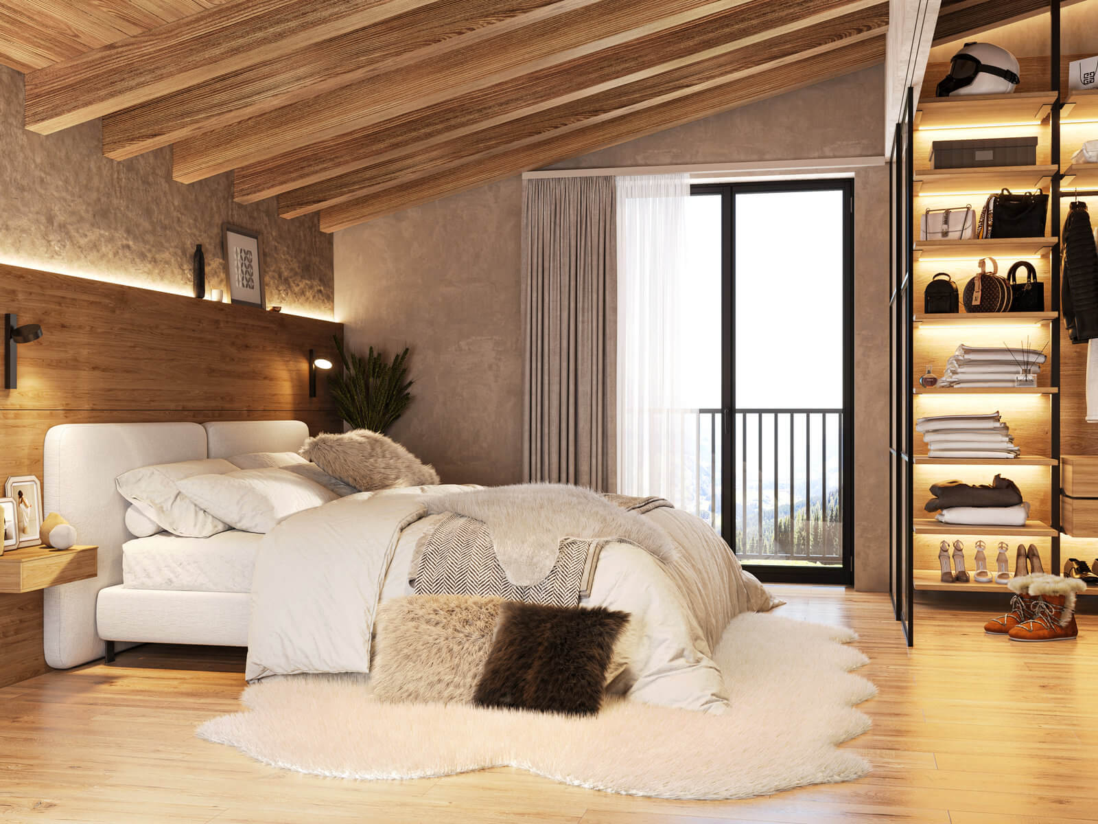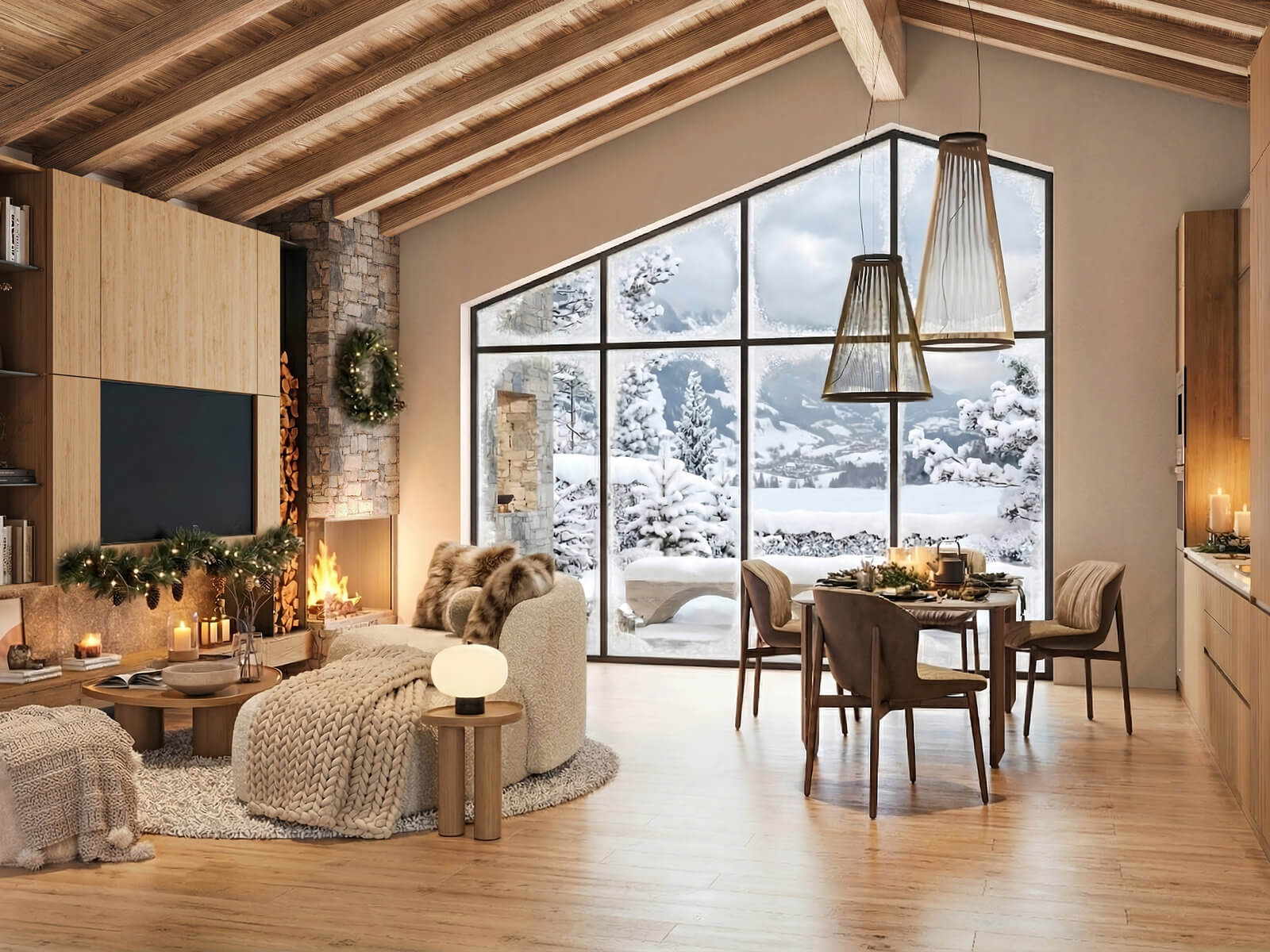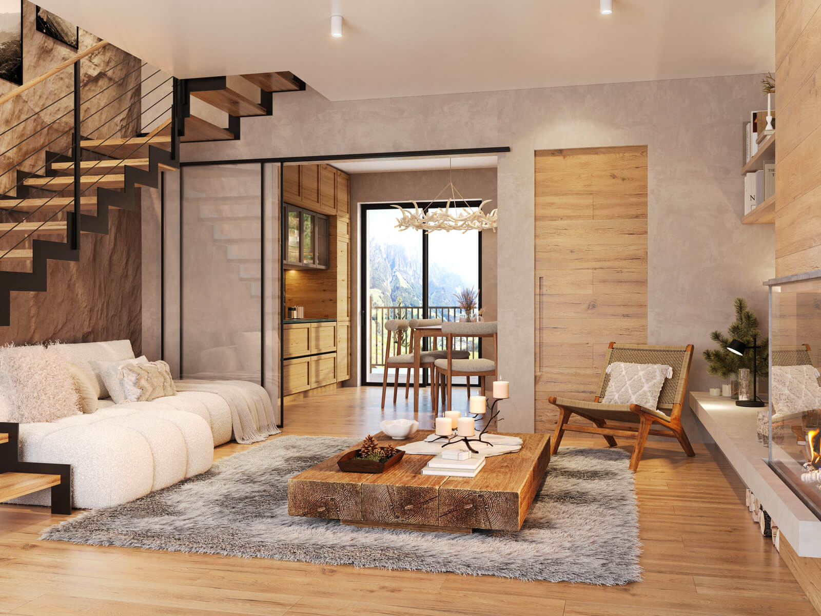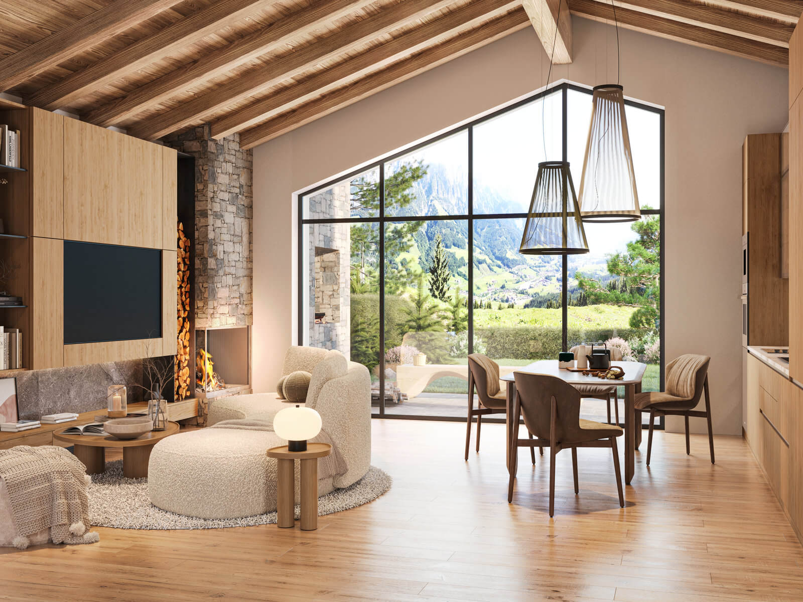 Gli interni degli chalet sono pensati per trasmettere calore e atmosfera, con finestre ampie che illuminano naturalmente ogni ambiente. Il materiale protagonista è il legno, scelto per pavimenti e finiture, capace di donare eleganza e una sensazione di comfort tipicamente alpina.